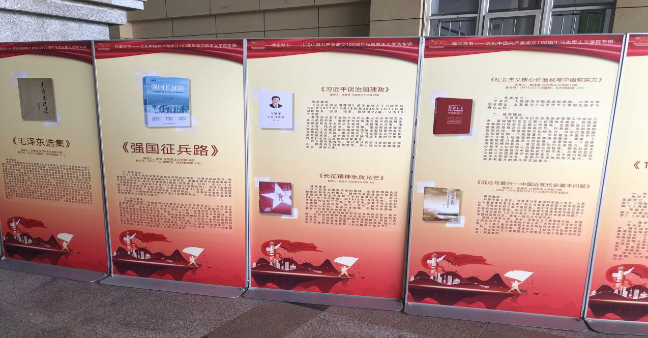 江汉大学图书馆组织相关馆员对马克思主义学院师生推荐的这些图书内容进行整理、编辑,整合成《书海拾贝——师生荐书》(庆祝中国共产党成立100周年马克思主义学院专辑),在图书馆官网“师生荐书”和“书林留声”栏目里展示。另外,图书馆一楼门厅线下印刷展板同步展出。