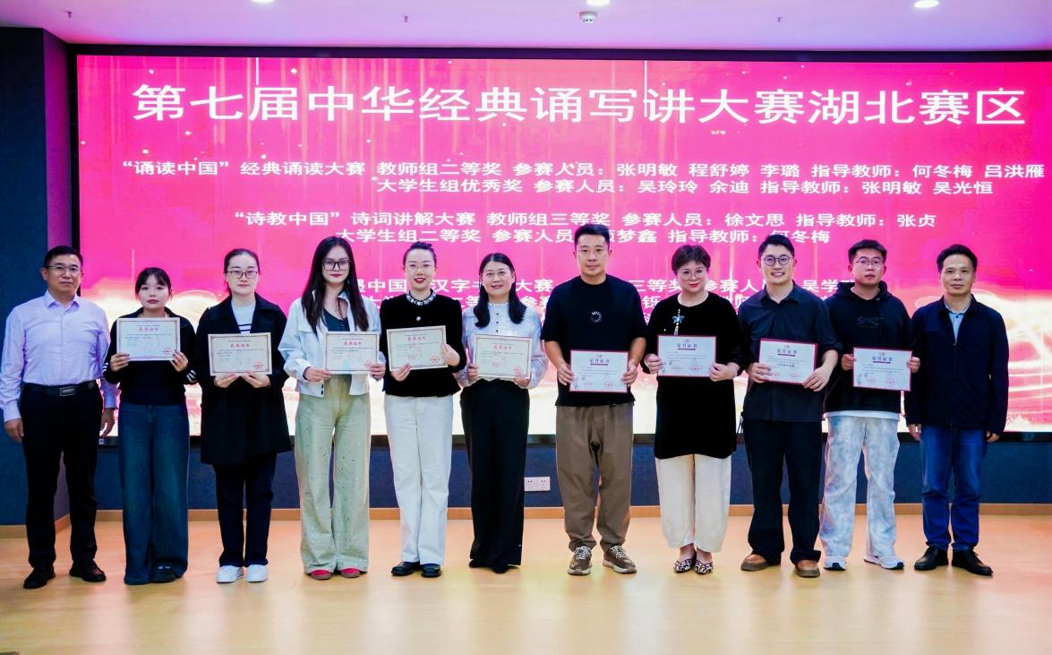 9月24日,学校开展颁奖典礼,校党委宣传部范雄飞、人文学院党委书记赵友法为第七届中华经典诵写讲大赛、全国语言文字应用能力大赛获奖师生颁奖。其中“诵读中国”经典诵读大赛(湖北赛区)张明敏、程舒婷、李璐荣获教师组二等奖(指导教师:何冬梅 吕洪雁)吴玲玲、余迪获大学生组优秀奖(指导教师:张明敏 吴光恒);“诗教中国”诗词讲解大赛(湖北赛区)徐文思获 教师组三等奖(指导教师:张贞)、项梦鑫获大学生组二等奖(指导教师:何冬梅);“笔墨中国”汉字书写大赛(湖北赛区)吴学聪获教师组三等奖、吴铄获大学生组软笔二等奖(指导教师:柳国良)、杜登科获大学生组硬笔二等奖(指导教师:赵国臣)。全国语言文字应用能力大赛中,金天、刘金悦等荣获专业组一等奖(指导教师:何冬梅、陈澜)。54名学生获全国二、三等奖及省级奖励。张明敏、阮裕荣获优秀指导老师,校语委办荣获优秀组织奖。