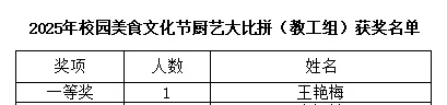 2025年10月31日,2025 年江汉大学校园美食文化节教工厨艺大比拼在学校南区篮球场热闹开赛。我院办公室主任王艳梅凭借精湛的厨艺,在激烈角逐中脱颖而出,喜获第一名!袁俊杰、刘硕荣获鼓励奖。美食节厨艺比拼已经落幕,但那些关于美食的热爱与创意,那些在活动中收获的快乐与成长,将永远留在我们的记忆里。 (院工会)
