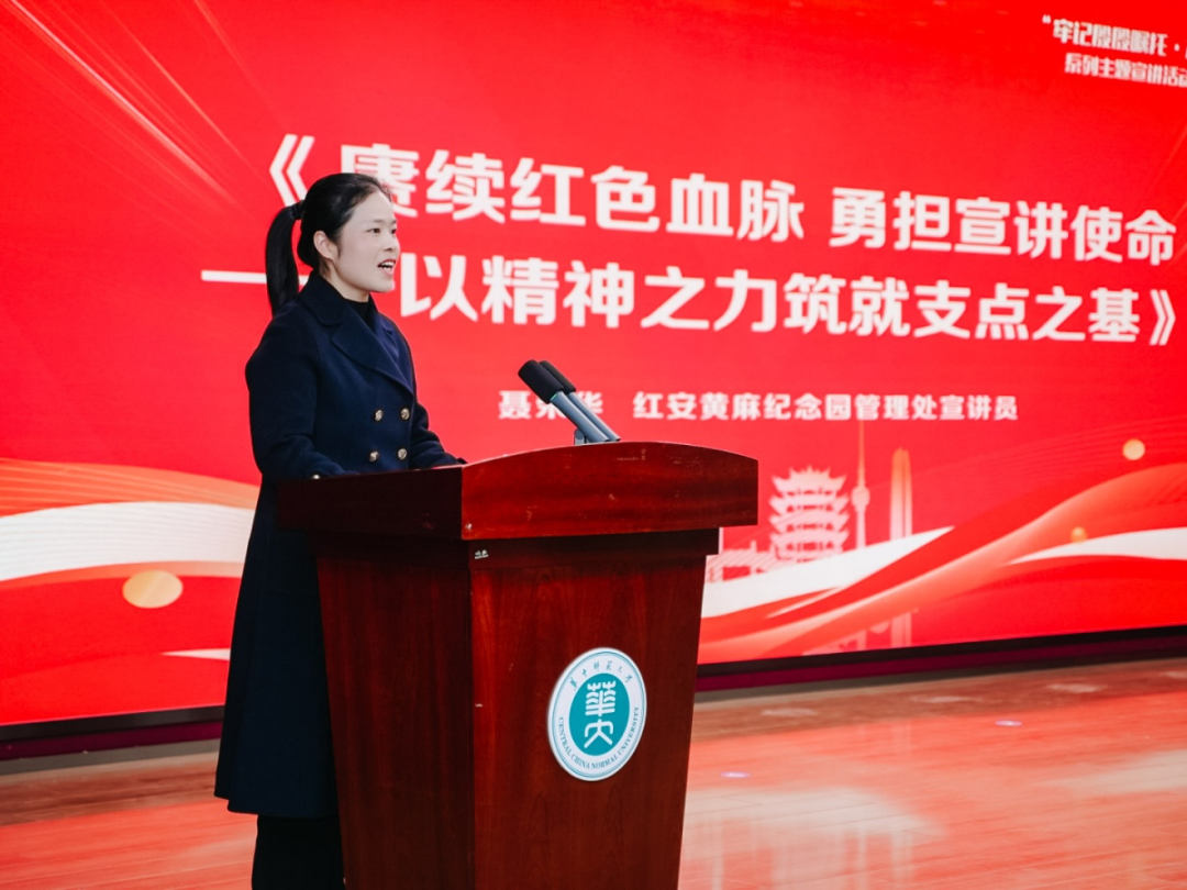 红安黄麻纪念园宣讲员聂荣华以《赓续红色血脉 勇担宣讲使命 以精神之力筑就支点之基》为题,动情讲述大别山革命历史与英烈事迹,号召新时代宣讲员做红色基因的“传火者”,让大别山精神在支点建设中焕发新的时代光芒。她本人累计为60余万游客讲解超3万小时,曾获湖北省党史知识竞赛一等奖。
