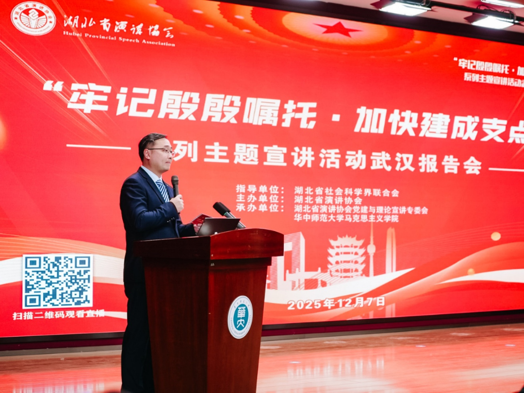 12月7日,由湖北省社会科学界联合会指导,湖北省演讲协会主办,湖北省演讲协会党建与理论宣讲专委会、华中师范大学马克思主义学院联合承办的“牢记殷殷嘱托,加快建成支点”系列理论宣讲活动武汉报告会在华中师范大学举行。来自全省理论界、教育界、基层治理、产业一线及高校师生代表近200人齐聚一堂,共话使命担当,共谋支点未来。