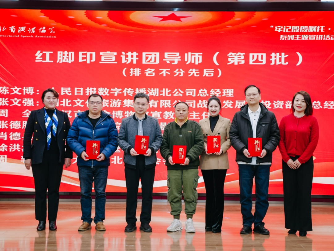 人民日报数字传播湖北公司总经理陈文博、退役老兵、一等功获得者肖德兵、黄冈师范学院传媒与影视学院院长张德胜、武汉革命博物馆宣教部主任周全、南华大学湖北校友会会长周轮等7位来自政、企、校、军等领域的优秀代表受聘为红脚印宣讲团第四批导师,省演讲协会理事、中建三局演讲协会秘书长胡洁,省演讲协会理事、长江职业学院播音系主任赵轲为导师颁发聘书;