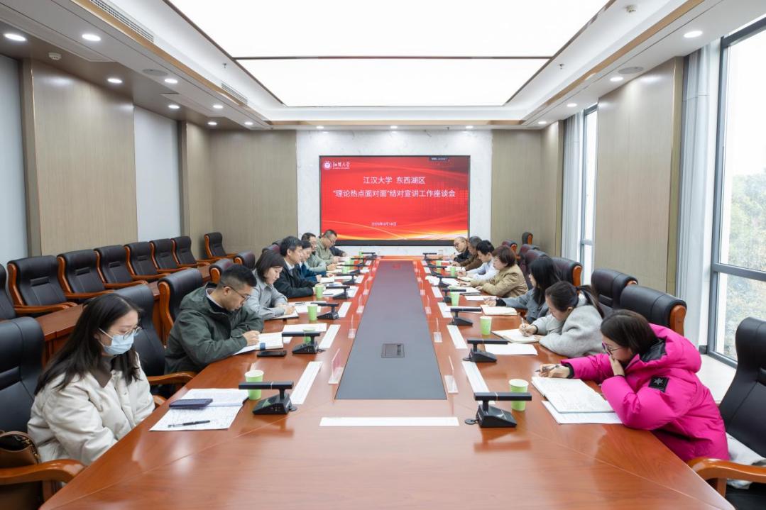 3月18日下午,江汉大学与东西湖区“理论热点面对面”结对宣讲工作座谈会在江汉大学行政楼217会议室召开。会议聚焦推动党的创新理论深入基层、深入人心,围绕深化校地协同、优化宣讲模式、提升“百马行动”实效展开深入交流,旨在打造资源共享、优势互补的理论传播与服务平台。