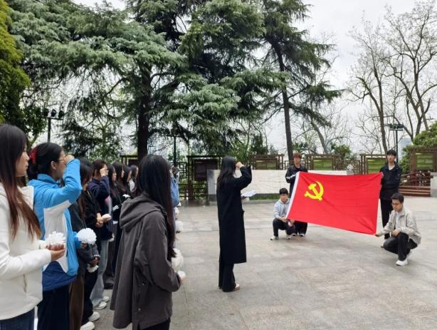 2025级马克思主义理论专业研究生、青年马克思主义研习社负责人黄晓雨作为学生代表,深情讲述了向警予烈士的革命事迹。从建党先驱的初心坚守到巾帼英雄的慷慨就义,烈士为革命事业奉献一生的壮举,让在场师生深受震撼与感动。紧接着,全体党员面向党旗重温入党誓词、全体团员面向团旗重温入团誓词,铿锵有力的誓言在陵园上空回荡,是师生们对先烈的庄严承诺,更是砥砺前行的坚定决心。